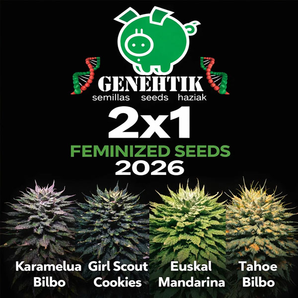 Promo 2x1 Genehtik Seeds. Compra paquetes de 1, 5 o 25 semillas de Karamelua Bilbo, Girl Scout Cookies, Euskal Mandarina o Tahoe Bilbo y llévate el doble. El paquete regalo será de la misma variedad y formato. Hasta fin de existencias.